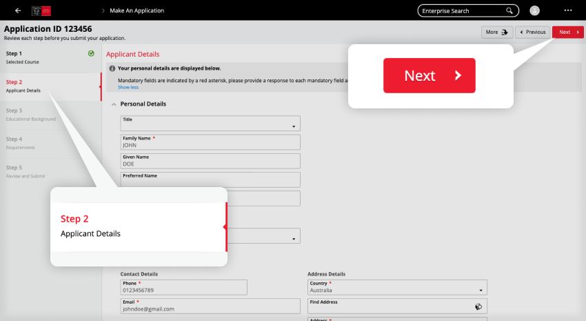 6. Next, you will see information related to Applicant Details and Educational Background. Update details as required then click Next to proceed.
