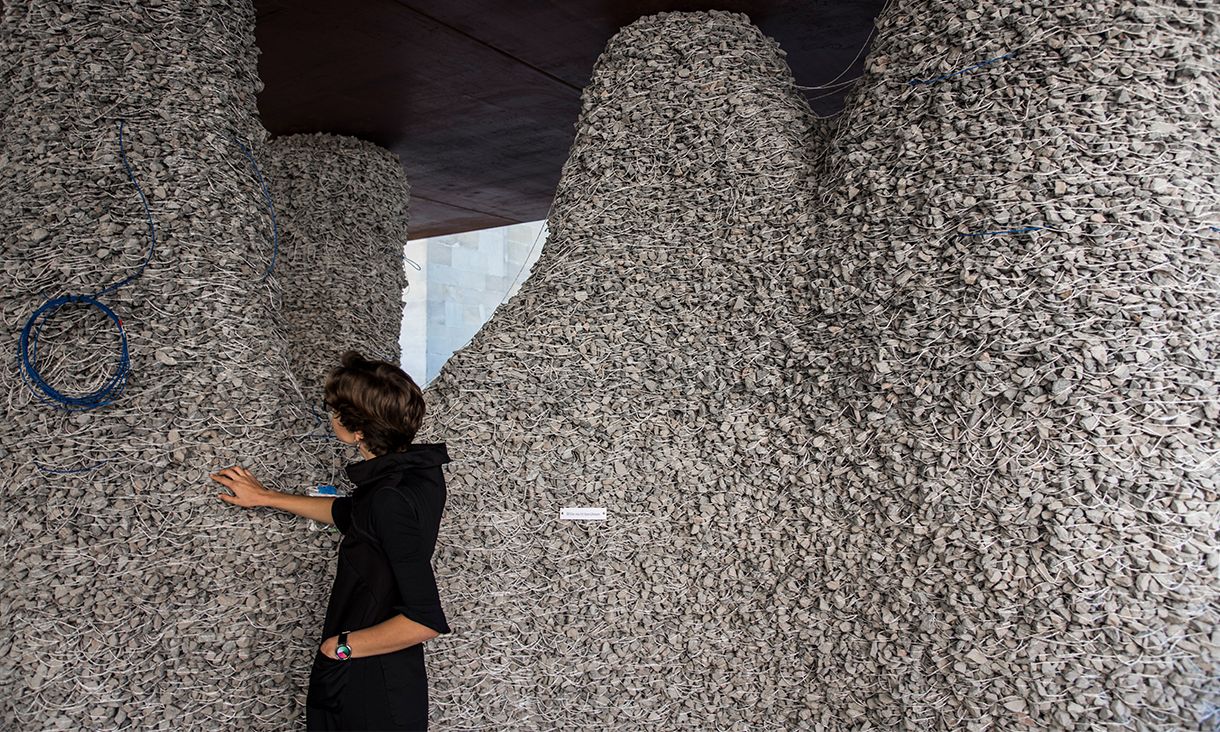“We stacked alternating layers of loose stones and textile string, arranged in loops, to create three-metre-tall structures. In 2018, we built a large-scale loadbearing structure as part of a public outdoor exhibition called ‘Hello, Robot!’ at the Gewerbemuseum Winterthur. The structure was assembled with a mobile robotic arm programmed in collaboration with researchers at ETH Zurich,” she says.