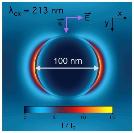 Calculated optical intensity distribution around a 100-nm-diameter liquid gallium-alloy nanoparticle in water.