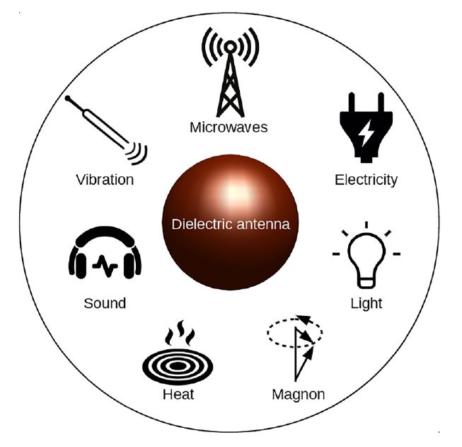 Conceptual illustration of a multiresonant dielectric antenna that mediates the coupling between different entities such as magnons, electricity, microwaves and light, sound and vibrations, and heat.