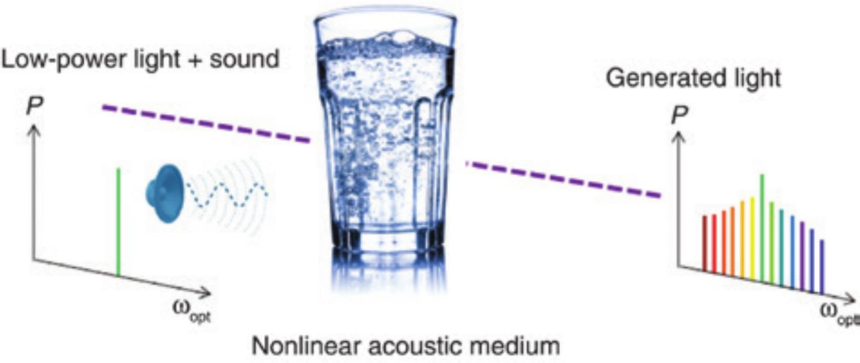 Schematic of the interaction of light with nonlinearly oscillating gas bubbles in water driven by an ultrasound pressure wave.