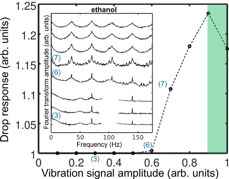 Experimental spectra showing the onset of a subharmonic response in a vertically vibrated drop of ethanol.