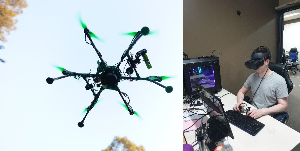 Researcher using virtual reality to assist with UAV (drone) navigation.